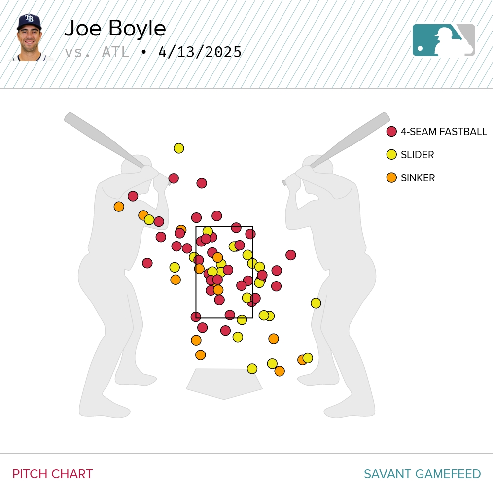 On Sunday, Boyle made his Rays debut by … no-hitting the Braves for five innings. Showcasing the 100 mph heat, a diving slider and a low-90s splinker in the Paul Skenes mode, Boyle was particularly effective early before walking two and hitting a batter to prompt the end of his day. It was not a clinic in precision.