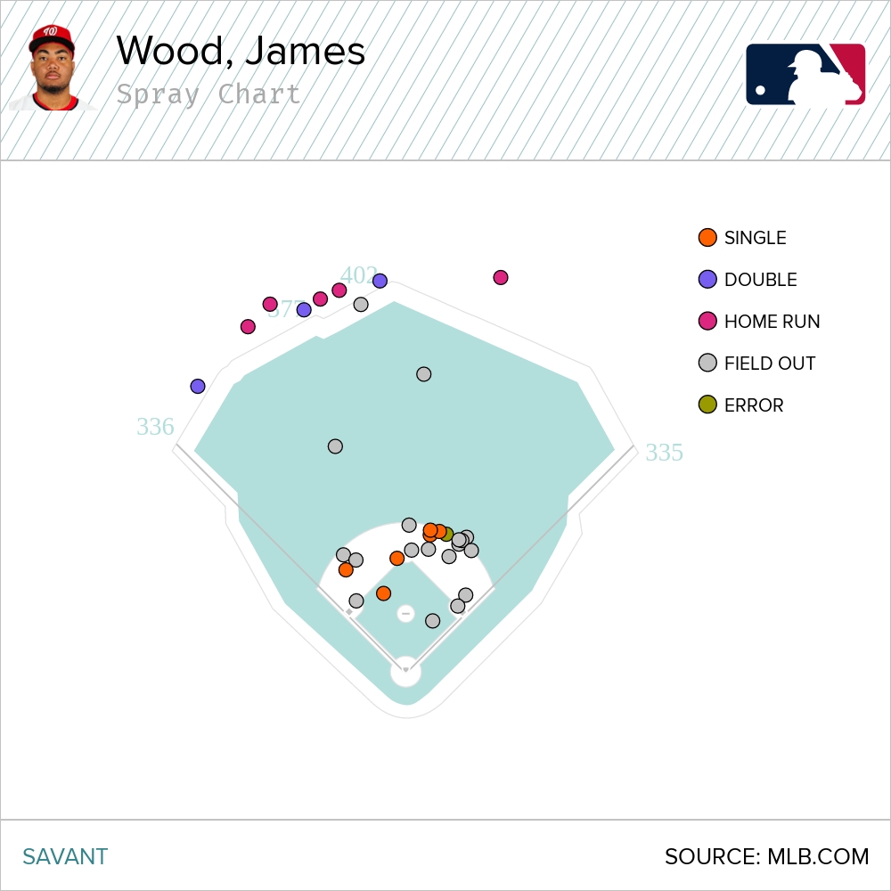 Wood is off to a strong start, batting .259/.385/.593, but he has barely touched that 10 foot to 300 foot range, logging just three hits via the usual route. Only 11 of his 33 batted balls have fallen in there, a league low 33% so far. In fact, he’s hit only one batted ball that cleared the infield on the fly without going 300+ feet. That means his spray chart looks sort like he’s playing a version of the game where the outfield is lava.