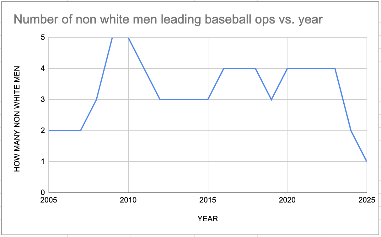 It’s not an especially sophisticated chart so if you’d rather just read the highlights, they’re as followed: Until this year, the number of non white men leading baseball operations ranged between two (2005-2007, 2023) and five (2009, 2010).