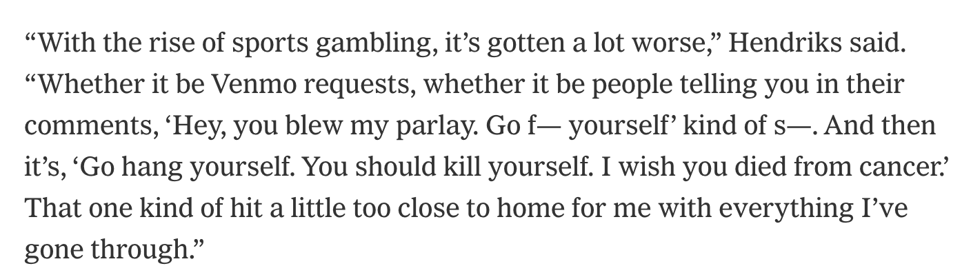 ⚾ But I want to be so clear: No level of performance or perceived effort merits the kind of fucked up online comments that have become increasingly common in the era of incredibly prevalent sports gambling. Liam Hendricks is the latest player to detail the death threats he, and his family, get in response to what happens in a baseball game. This is pathological behavior. —HK