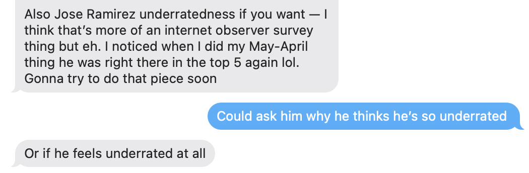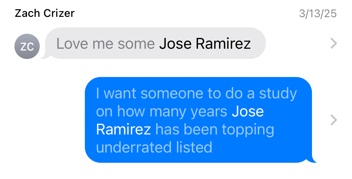 We landed, briefly, on a topic that has come up periodically in six years of talking to each other about baseball: José Ramírez is underrated. So everyone says, anyway. And has been saying. For a while.