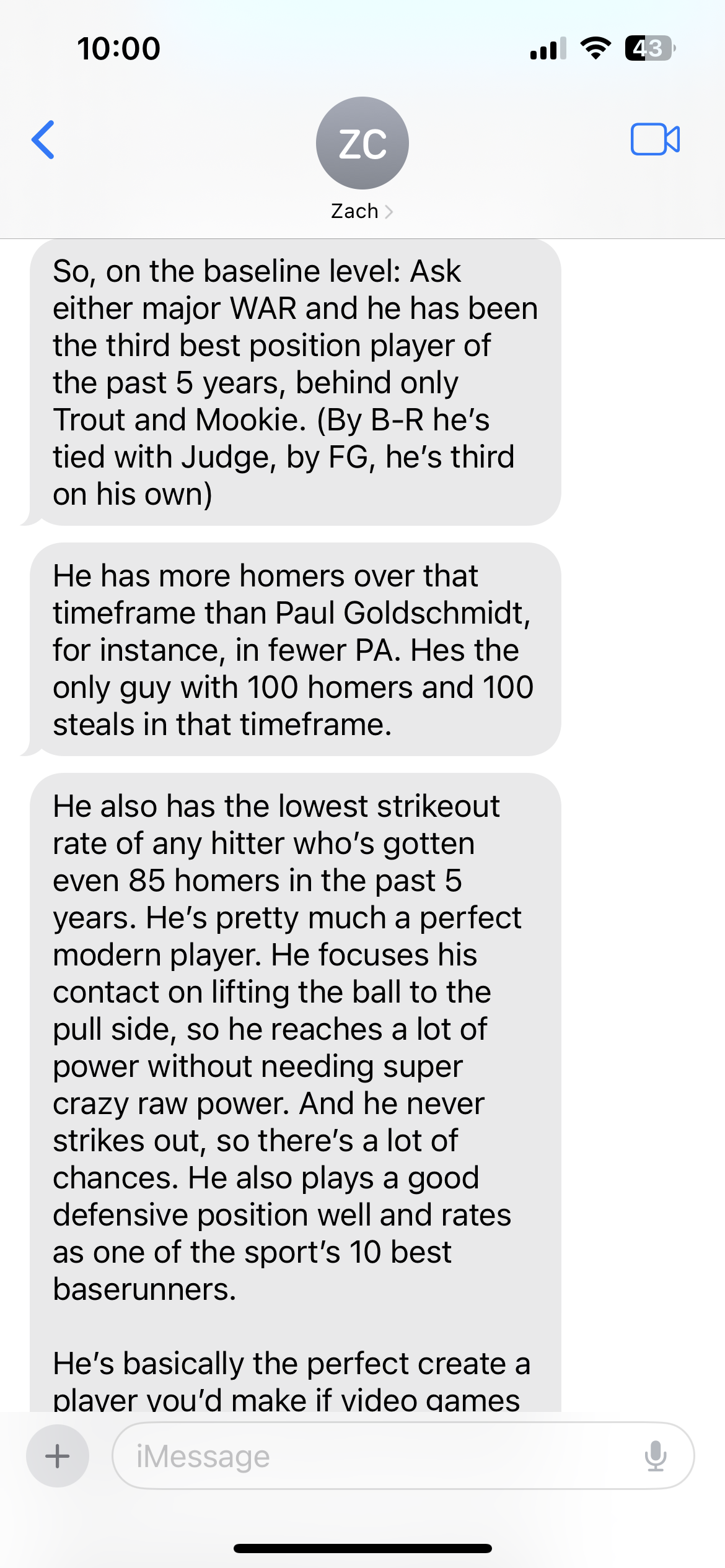 Avoiding splashy headlines, however, is not the same thing as being underrated. I think Ramírez is pretty much a perfect modern ballplayer, as I wrote when he signed that deal, and I also think the traditional methods of recognition have recognized him. He has made six All-Star teams and finished top-5 in MVP voting five times. He is averaging 34 homers and 29 steals per 162 games since 2017. By Baseball-Reference’s MVP shares tracking, he’s seventh among active players, a fraction of an eyelash behind Aaron Judge, who has two MVPs.