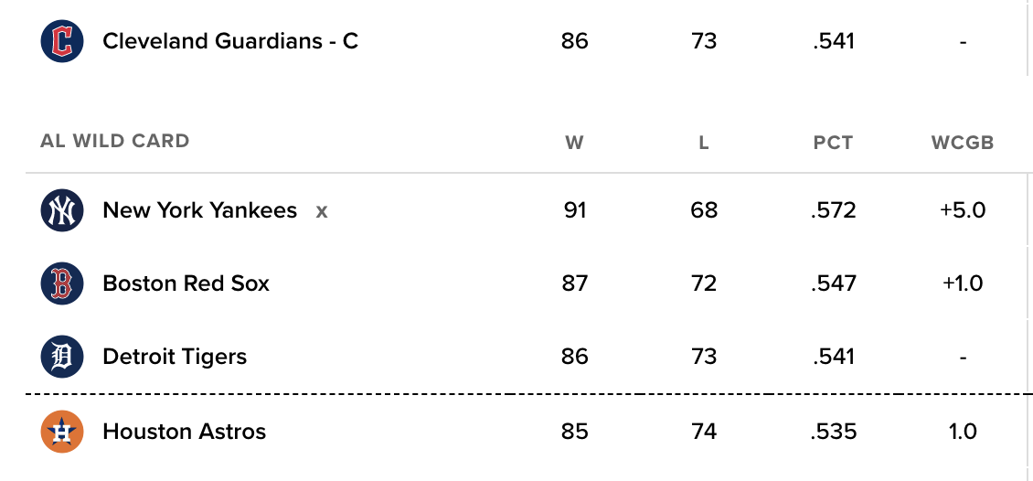 Houston’s eight-year streak of postseason appearances is in serious jeopardy, and the Astros will need help to make it nine. Realistically, they need to win out and hope someone else stumbles, as they would lose tiebreakers to the Red Sox, Tigers and Guardians.