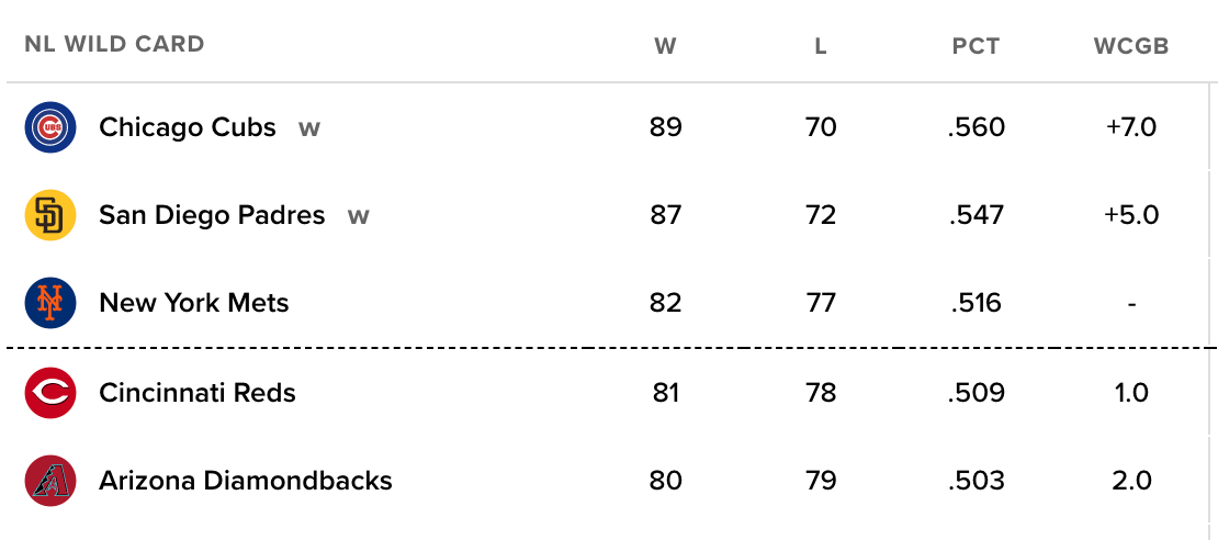 A 37-53 run starting June 13 saw the Mets drop from one of the best teams in baseball to barely clinging to the final Wild Card spot. They actually started the week on the outside looking in, but managed to take two of three from the Cubs in the most recent series. That’s put them a game up on the Reds and two games up on the Diamondbacks — but both the D-backs and Reds have the tiebreaker over the Mets, should it come to that.