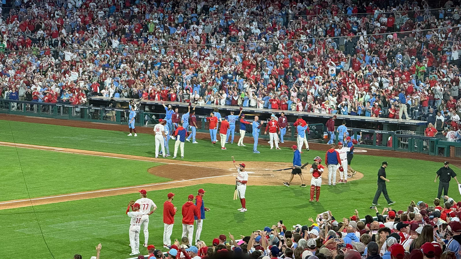 The game was a pastiche of baseball but remained interesting. Jesus Luzardo started for the Powder Blues and went three innings; all nine outs were strikeouts. Bryce Harper homered off Walker Buehler. Aaron Nola pitched for the Pinstripes and was basically the good version of Aaron Nola. There was a nice play in the field; I can’t even remember who it was or when it happened because the game didn’t matter. Mainly I stood around and cheered loudly for everyone except Nick Castellanos, but only because I thought it’d be really funny if he got benched in the intrasquad game. The whole night was just an excuse to hang out with other Phillies fans and pay $20 for a beer. The Powder Blues won 3-0, but they played the bottom of the 7th anyway so Jhoan Duran could pitch and everyone could practice his entrance for the playoffs. It was a scrimmage for the fans, too—31,363 of them. The Phillies could’ve sold more $10 tickets if they’d opened more sections.