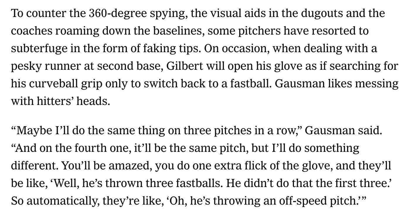 Now, The Athletic has a feature out about this whole broader phenomenon — the reality of prevalent pitch tipping, the fake-out signaling from the hitting team to give the impression of pitch tipping, and (an element of this all I hadn’t even considered) pitchers attempting to thwart this by faux tipping to lead batters astray!