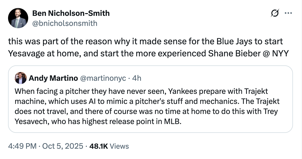 ⚾️ I’m putting this here because Yankees and Blue Jays pitchers both get quoted in the story although it’s a more general baseball bit/bob: