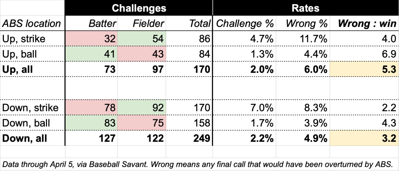 In the early going, the players’ confidence levels in assessing the zone don’t diverge that much with the umpires who spent years informing that understanding. That leads to plenty of those razor-thin margins, yes, but more importantly: Challenges are being spent on low pitches, where the umpires are relatively more effective.