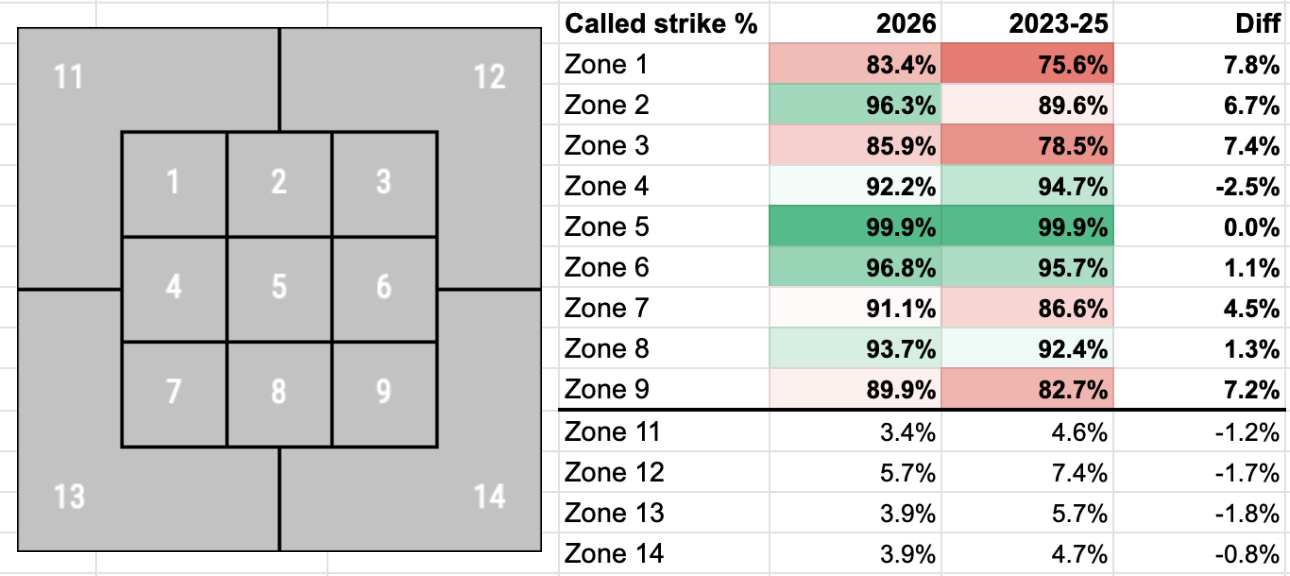 Those numbers mainly concern the umpires, who are familiar with their task even as it now comes with more, uh, opportunity for accountability. Their behavior, consciously or not, is evolving further toward matching the prescribed zone. In all but one region, they are beating their 2023-25 marks by the system’s binary standards of correctness.